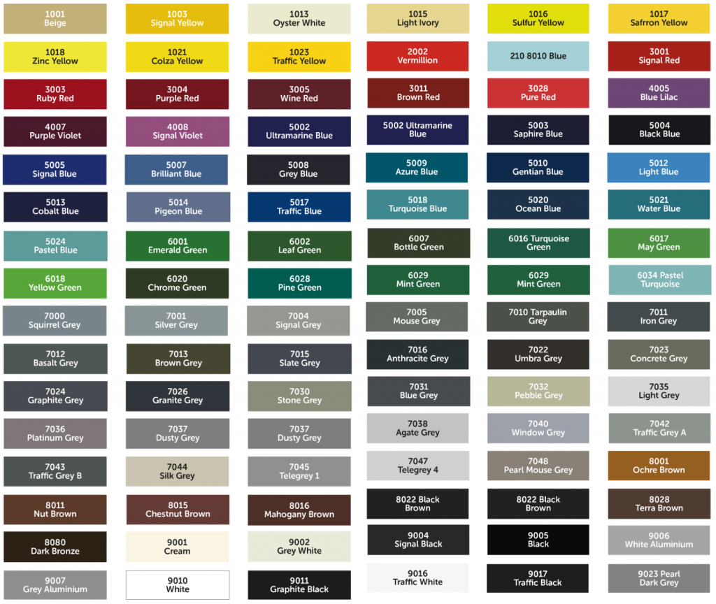 A full range of RAL and BS colours are available, including metallics and pearlescent as an optional extra.